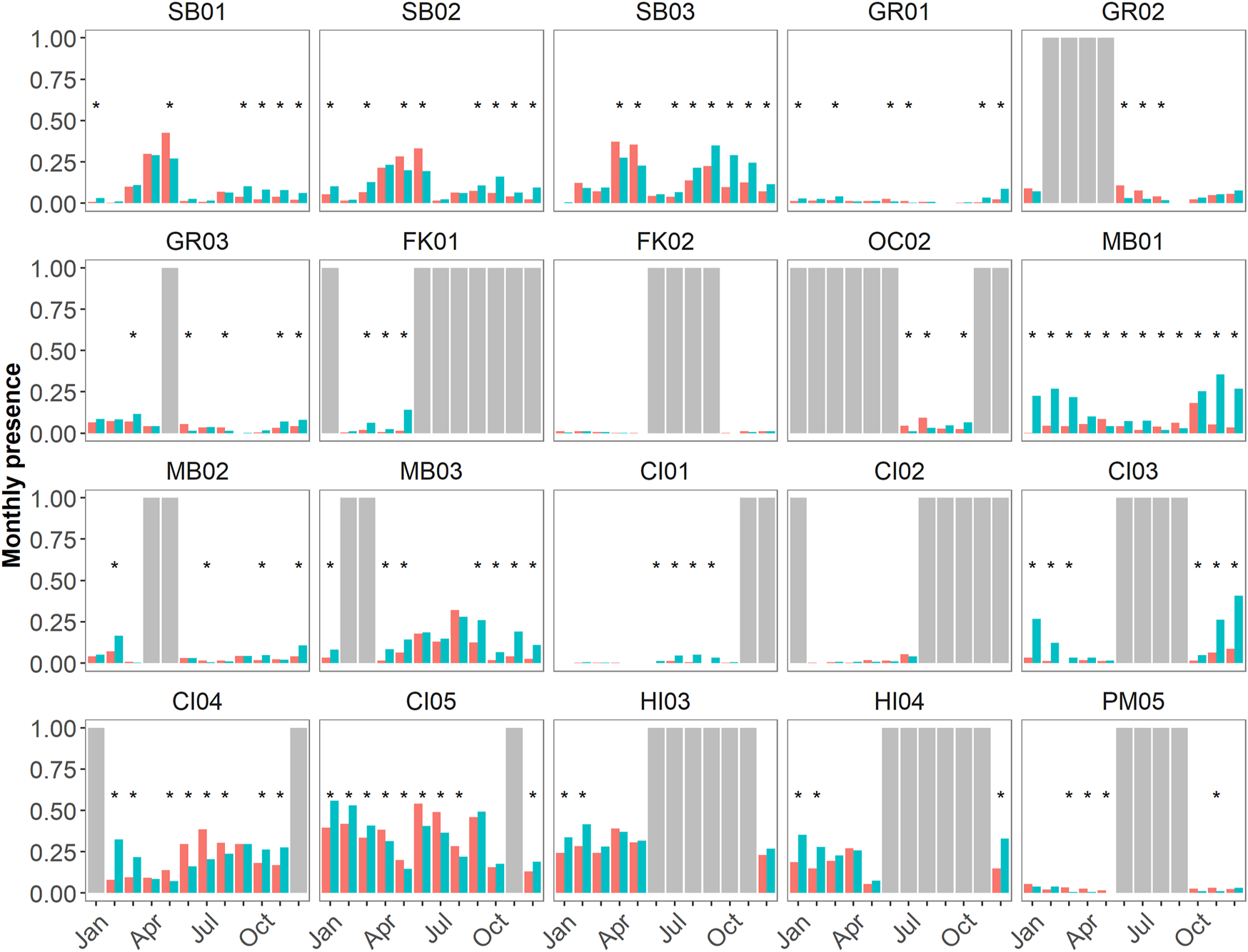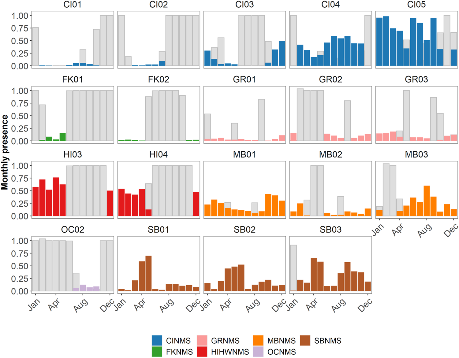 Monthly presence of delphinids at each site within a sanctuary expressed as a ratio (0–1) where the number of hours of positive presence are normalized by the number of hours in a month. These are then color coded by sanctuary (CINMS = Channel Islands National Marine Sanctuary, FKNMS = Florida Keys National Marine Sanctuary, GRNMS = Gray’s Reef National Marine Sanctuary, HIHWNMS = Hawaiian Islands Humpback Whale National Marine Sanctuary, MBNMS = Monterey Bay National Marine Sanctuary, OCNMS = Olympic Coast National Marine Sanctuary, SBNMS = Stellwagen Bank National Marine Sanctuary). The number of hours per month without data collection at each site are also normalized by the number of hours in a month and are represented as grey bars.