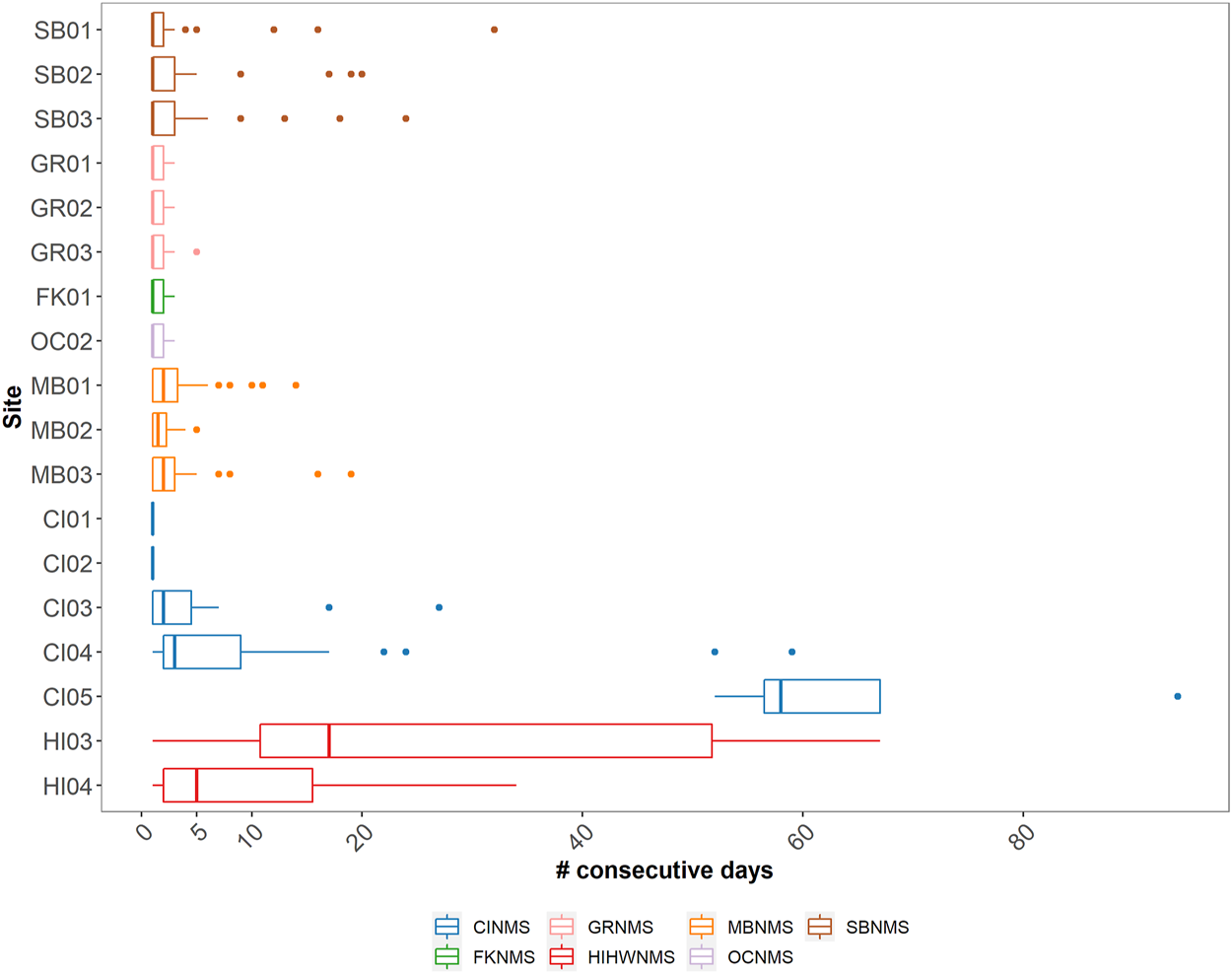A boxplot showing the median and quartile values of the number of consecutive days delphinid whistles were present across 18 passive acoustic recording sites within seven NMS, divided into three main regions: East Coast Region United States (US) - Stellwagen Bank National Marine Sanctuary (SBNMS), Gray’s Reef National Marine Sanctuary (GRNMS), Florida Keys National Marine Sanctuary (FKNMS); West Coast Region US - Olympic Coast National Marine Sanctuary (OCNMS), Monterey Bay National Marine Sanctuary (MBNMS), Channel Islands National Marine Sanctuary (CINMS) and Hawaiʻi Region US - Hawaiian Islands Humpback Whale National Marine Sanctuary (HIHWNMS). FK02 is not shown as there were no consecutive days of delphinid acoustic presence at that site.