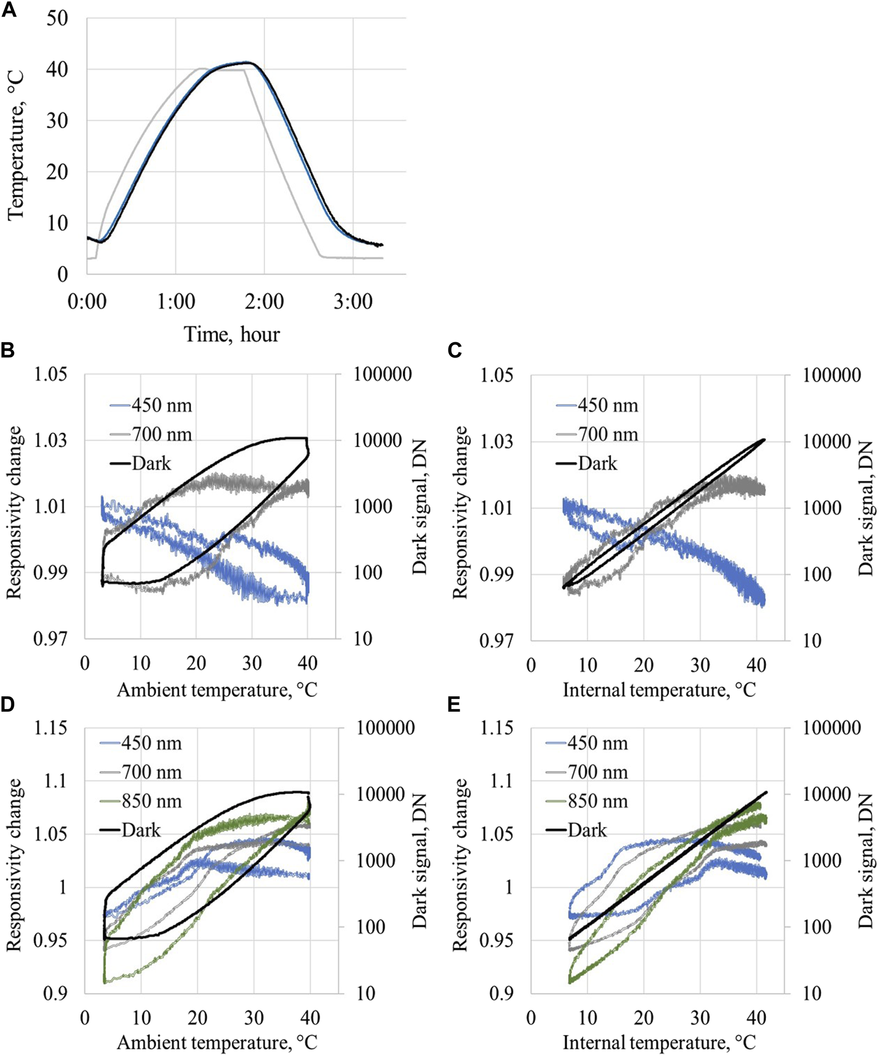 Dynamic thermal properties of the radiance and irradiance OCRs. (A) Time lags and differences between different temperature sensors (gray: ambient temperature sensor, blue: internal temperature sensor (added ad hoc in the case of TriOS): black: temperature calculated from the dark signal) at varying temperatures measured for a radiometer immersed in water. (B) Relative variations of optical signal of HyperOCR radiance sensor as a function of ambient temperature (blue: 400 nm, gray: 700 nm). Variation of the dark signal (black) is shown using logarithmic scale. (C) Optical and dark signal of HyperOCR radiance sensor as a function of internal temperature. (D) Optical and dark signal of HyperOCR irradiance sensor as a function of ambient temperature. (E) Optical and dark signal of HyperOCR irradiance sensor as a function of internal temperature.