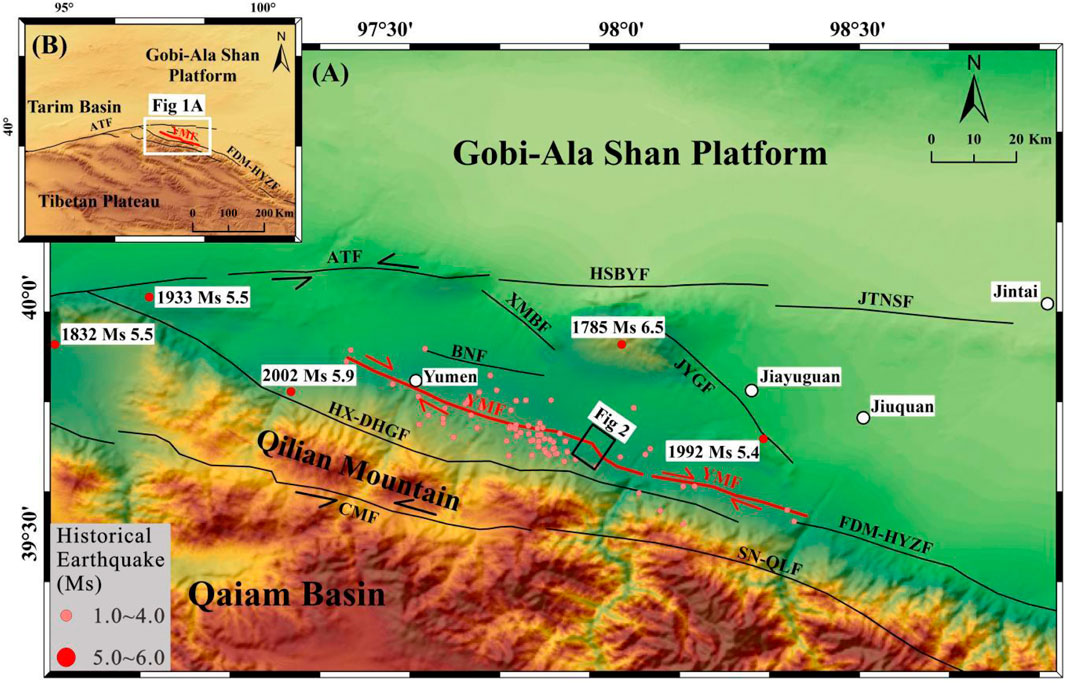 Figure 1. Geological setting of the Yumen Fault (YMF). (A) Red line highlights YMF. Black lines show the distribution of the surrounding major faults: ATF, Altun Tagh Fault; HSBYE, Heishanbeiyuan Fault; JTNSF, Jintananshan Fault; XMBF, Xinminbao Fault; BNF, Bainanshan Fault; JYGF, Jiayuguan Fault; HX-DHGF, Hanxia–Dahuagngou Fault; FDM-HYZF, Fodongmiao–Hongyazi Fault; CMF, Changma Fault; SN-QLF, Sunan–Qilian Fault (faults are Deng et al., 2002). Red dots along YMF indicate historical and instrumental earthquake. (B) Inset shows the location of Panel (A) in the northeastern Tibetan Plateau. White rectangle shows the location of Panel (A) along YMF.