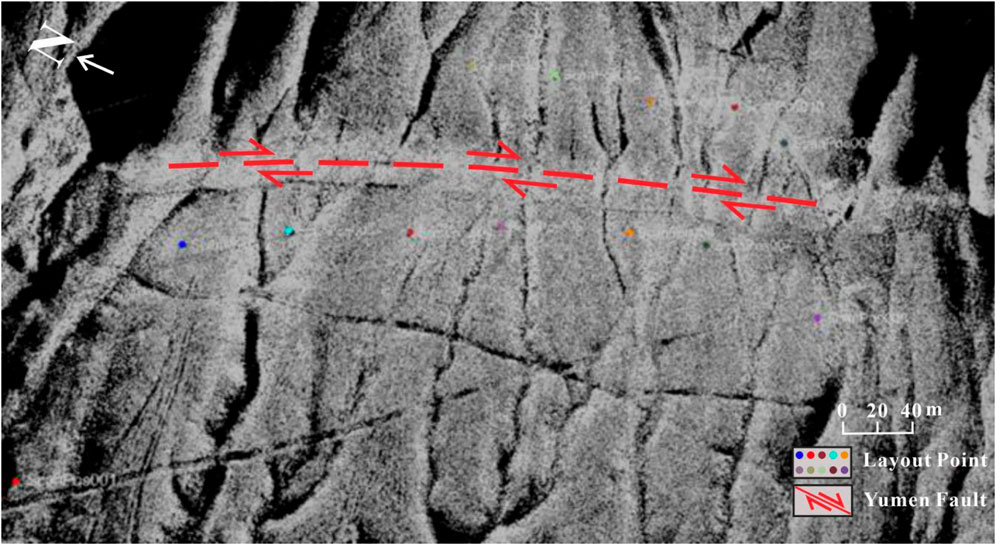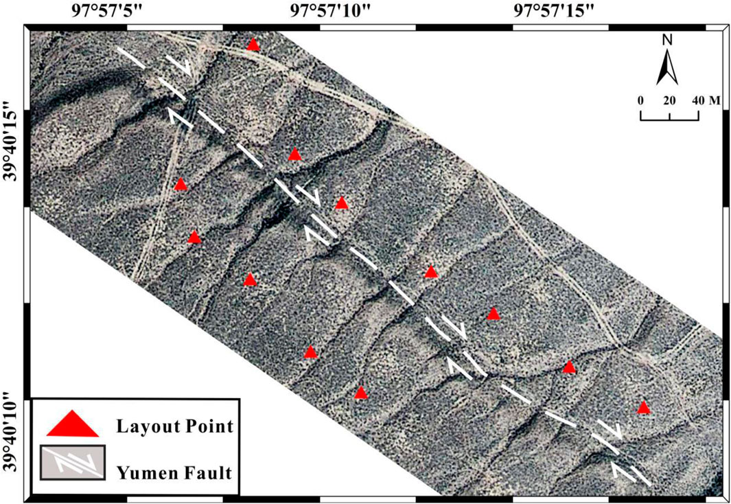 Using high-resolution topographic remote sensing images and high-precision topographic data, tectonic geomorphic dislocation can be constrained, fault rupture history restored, and paleoseismic events identified. Based on this, the distribution characteristics of seismic displacement and the fault rupture mode can be defined, and the recurrence cycle of strong earthquakes can be estimated. Therefore, ground-based LiDAR was used in this study to conduct high-density point clouds in a typical surface rupture zone in the western section of Yumen Fault. The topography of this area is relatively complex. To ensure that the collected point-cloud data can adequately restore the actual field scenes without unnecessary data loss, reasonable site layout was carried out through remote sensing imagery and field investigation (Figure 2).