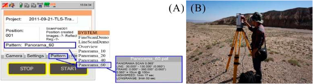 Figure 3. Ground-based LiDAR scanning setting and field work diagram. (A) Ground-based LiDAR scanning setting. (B) Field work diagram.