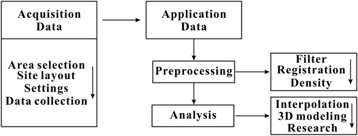 The ground-based LiDAR scanning survey was mainly divided into acquisition and processing procedures (Figure 4). Data acquisition where the reasonable development of the scanning scheme and site layout is according to the actual field terrain is paramount. Before data collection, the scanning parameters of each station should be set according to the actual working requirements (Figure 3A), such as scanning distance, camera exposure, device storage, and GPS check. During data acquisition, the tripod should be as stable as possible to reduce jitter, and attention should be given to the heat dissipation and power supply of the instrument. The second part is point-cloud processing analysis. The first stage of this part is point cloud pretreatment—mainly filtering, registration, and density—and the second stage is point cloud application analysis, which mainly includes interpolation filling, 3D modeling, application research, and analysis.