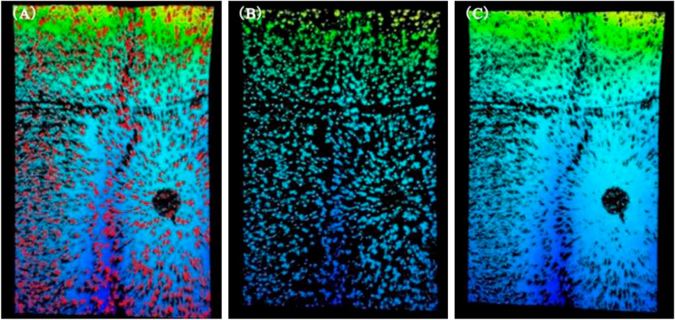 Figure 5. Removal of noise point cloud data. (A) Original data; red dots represent the distribution of noise points generated by the jump boundary and the atmosphere; (B) deleted noise point cloud data; (C) ground point cloud data after noise removal.