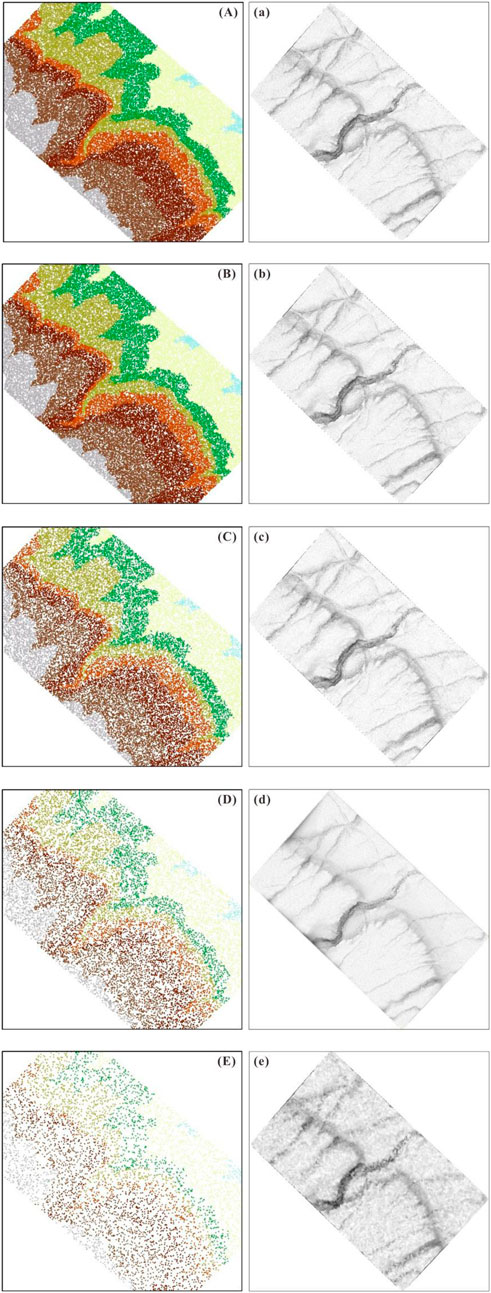 Figure 9. Point cloud data of different densities and corresponding DEM. Point cloud density: (A) 100%; (B) 75%; (C) 50%; (D) 20%; (E) 10%, corresponding to the DEM for (a–e), respectively.
