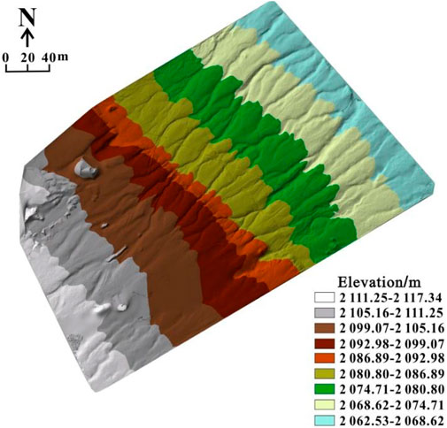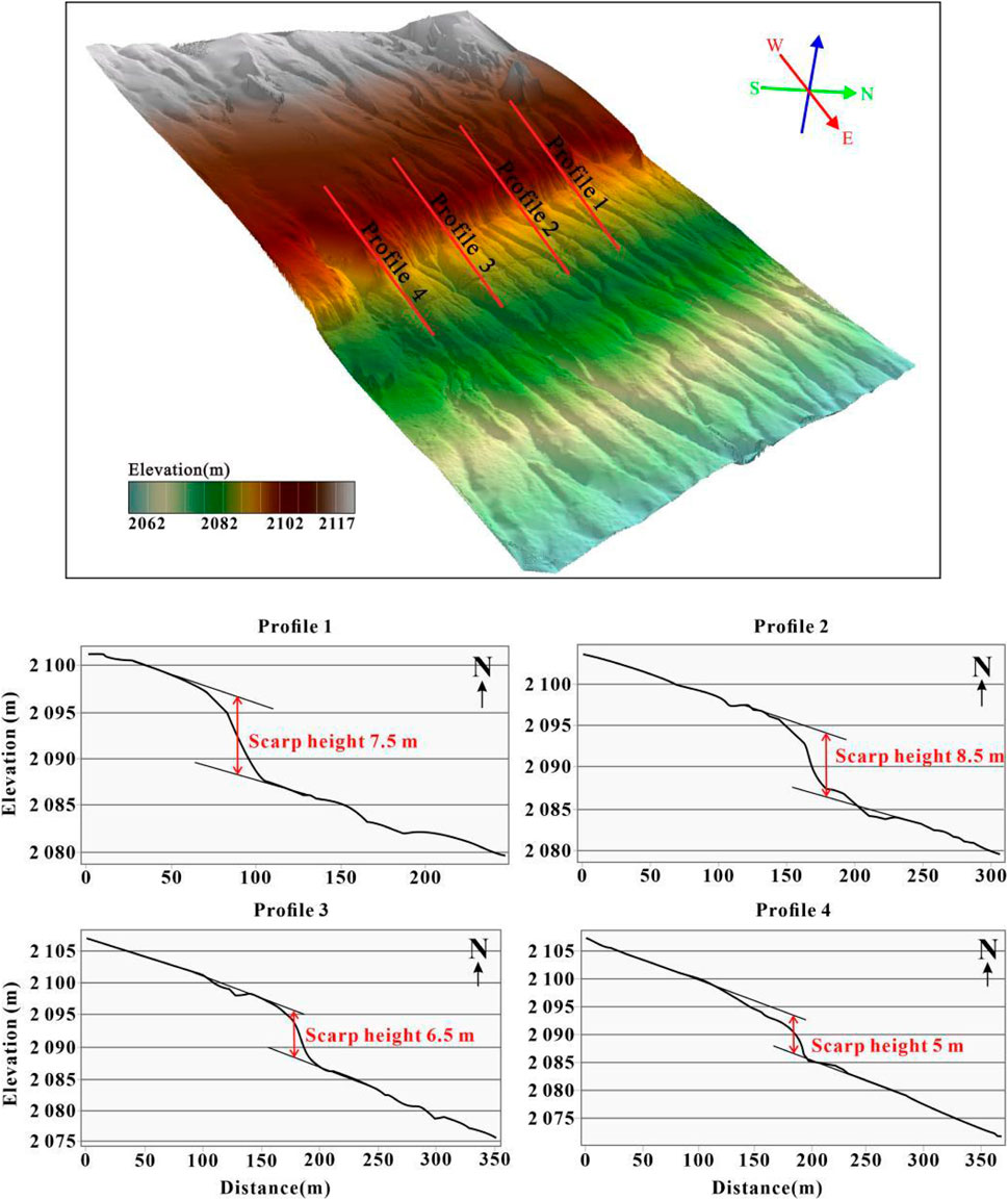 The Yumen Fault features a thrust nappe, and many fault scarps are formed along the surface rupture zone, which can be regarded as the vertical distance of fault activity. To reflect the movement characteristics of the fault thrust nappe, this study used high-density point cloud data to generate high-precision DEM and performed topographic profile analysis with the same distance along the direction across the surface rupture. As shown in Figure 15, fault scarps are obvious, and each profile has a certain scarp height. The four scarps are 7.5 m, 8.5 m, 6.5 m, and 7.5 m high. Based on exploration and dating in this area, the surface rupture in Xigou Ore was inferred to have been formed by earthquake induction during the Holocene and to have undergone four paleoseismic events (Li et al., 2016). Therefore, the average height of the steep ridge formed in the four paleoseismic events in this area can be inferred to be approximately 6.9 ± 1.6 m, and the average height of the steep ridge caused by each seismic event approximately 1.7 ± 0.4 m.