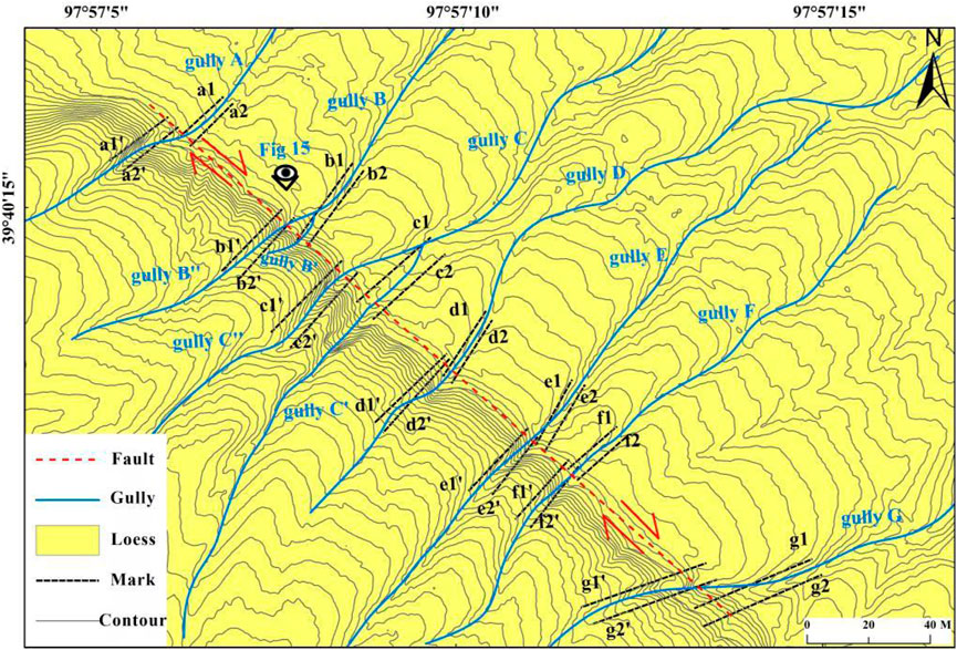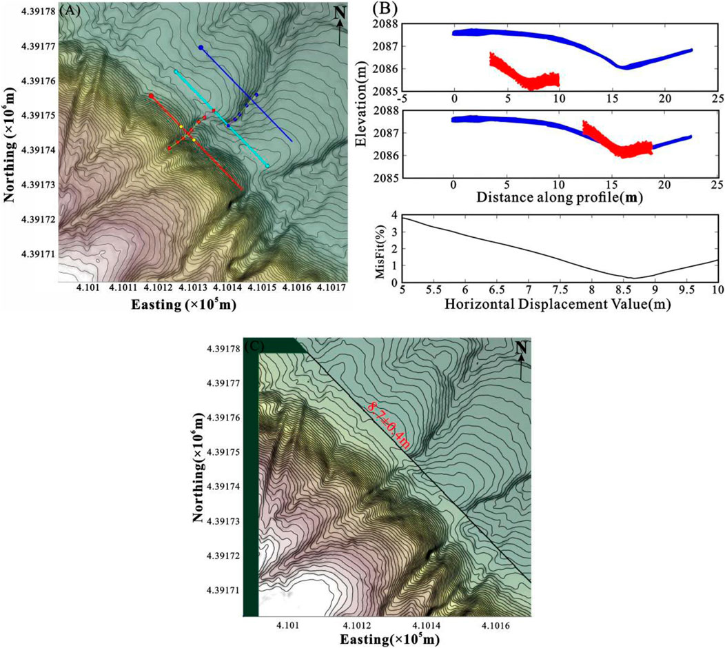 The high-resolution remote sensing images and field investigation results showed that the surface rupture zone at the west side of Xigou Ore has obvious dextral strike–slip displacement in several gullies caused by earthquakes (Figure 13). As shown in Figure 13, the normal strike of gully B and gully C should be along gully B′ and gully C′, respectively. However, the earthquake caused obvious dextral dislocation at the fault trace, forming new gullies B″ and C″. Gullies B′ and C′ are ancient and abandoned owing to the occurrence of the earthquake, but gully C′ has been well preserved because of long-term rain erosion. Considering gully B as an example, the LaDiCaoz tool is a displacement measurement tool developed by Zielke and Arrowsmith (2012) based on Matlab and is used to measure gully displacement (Figure 14). As shown in Figure 14A, through horizontal or vertical stretching, when the mismatching value is lowest, the overlap degree of the red line and blue line is highest. Therefore, the most reasonable recovery position of the slope of the dislocation terrain was obtained. By the vertical or horizontal stretching and moving of gully B″, the dislocation topographic profile on both sides of the fault obtained the optimal recovery position. The optimal horizontal displacement of gully B″ is 8.7 m (Figure 14B). According to the geological marker in Figure 13, the distance between markers b1 and b1′ is 9.1 m, and the distance between markers b2 and b2′ is 8.3 m. The error range of this gully is approximately 0.4 m, so, the horizontal dislocation of gully B is 8.7 ± 0.4 m (Figure 14C). Therefore, the displacements of gullies A, C, D, E, F, and G are 7.4 ± 0.2 m, 15.3 ± 0.3 m, 4.8 ± 0.5 m, 5.0 ± 0.3 m, 2.3 ± 0.4 m, and 13.9 ± 0.1 m, respectively. The displacements of gullies A, B, C, and G are large and presumably caused by multiple seismic events, while the displacements of gullies D, E, and F were small and presumably caused by a single seismic event.