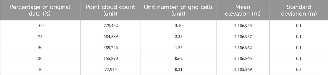 As the DEMs for all density levels were generated with the same resolution, they have a common number of grids, and their grid units correspond. Therefore, the DEM files of each density raster are first converted to point element files; the number of points is the same as the number of rasters, and the point element attribute is the elevation value of the center of its corresponding raster cell. To determine the error statistics, 10,000 points were randomly selected from the DEM of each density level. Figures 9A–E shows that the number of elevation points gradually decreases as the point cloud density level decreases and point clouds become increasingly sparse. Meanwhile, for DEM corresponding to each density, it is difficult to determine the difference in its information content by only human observation (Figures 9A–E). This necessitates statistical analysis of the relevant parameters of DEM generated by each density level (Table 3) to quantitatively and intuitively show the differences between different cloud compressed density data sets and their corresponding DEM. As the point cloud compression density decreases, the total number of point clouds at each level gradually decreases from the original 779,452 to 77,945. At the same time, with the same horizontal resolution, the number of points contained in unit grid cells also gradually decreased under the premise of the same total number of DEM grids. Within the 100%–20% range, the mean elevation and standard deviation decrease as density decreases, although the amplitude is small. To achieve efficient and rapid acquisition of topographic and geomorphic model results, the calculation cost is reduced, and to ensure modeling accuracy, the optimal point cloud compression density was determined to be 20% based on the research and analysis of the optimal point cloud density of micro-topographic DEM.