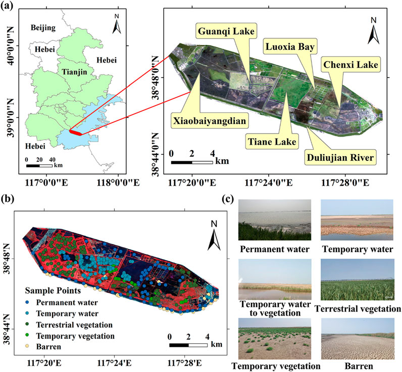 Figure 1. Location of the study area and sample points. (a) shows the geographic location of the study area, mapped with the false-color composite image of B5 (NIR), B4 (R) and B3 (G). (b) shows the spatial distribution of sample points, mapped with the true-color composite image of B4 (R), B3 (G) and B2 (b). (c) shows the field observation on 18 July 2023.