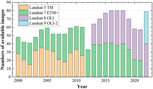 There are all series of Landsat images on GEE, with three product types. In consideration of space, time and spectral resolution, we used Landsat-5 TM, Landsat-7 ETM+, Landsat-8 OLI and Landsat-9 OLI-2 of Level-2 types which are the surface reflectance obtained after orthophoto correction and atmospheric correction. Notably, Landsat-9 OLI-2 represents an enhanced sensor system compared to Landsat-8 OLI, featuring improved radiometric performance and enhanced signal-to-noise ratio. For each image, we selected five spectral bands: three visible bands (Blue, Green and Red), the near-infrared (NIR) band, and the short-wave infrared (SWIR) band, all with a consistent spatial resolution of 30 m. A total of 1379 images (322 Landsat-5, 654 Landsat-7, 364 Landsat-8 and 39 Landsat-9 images) covering the study area from 2000 to 2022 were collected, and the distribution of images per year is shown in Figure 2. Optical image acquisition is greatly affected by the atmosphere, and some images contain cloud noise. Therefore, we must apply cloud mask to the acquired image to remove pixels affected by clouds and cloud shadows. We used the band of “QA_PIXEL” (QA), which can detect clouds and cloud shadows of each image, to remove bad-quality observations. Finally, we generated a dataset containing all images from 2000 to 2022.