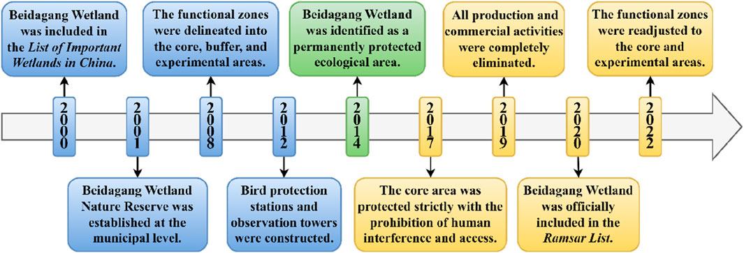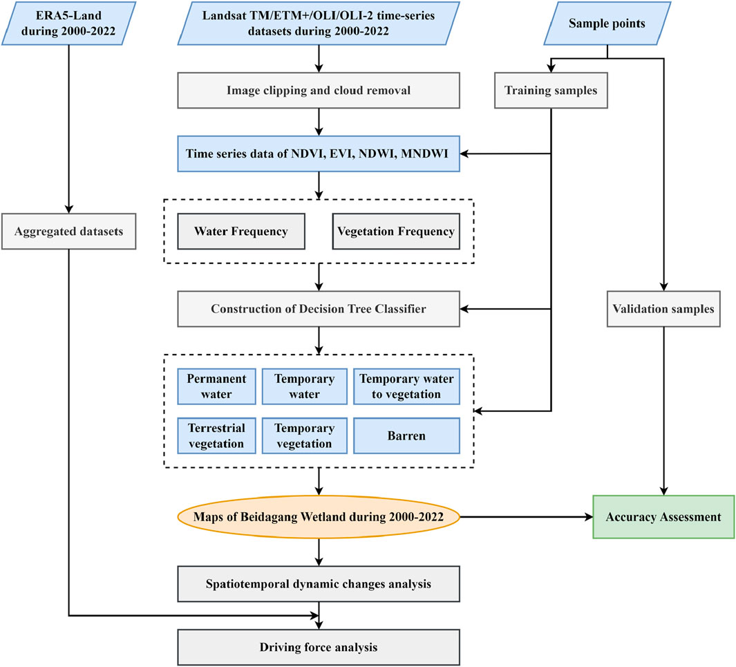 In this research, we take Beidagang Wetland as the study area, combining GEE with Landsat 5/7/8/9 time-series images during 2000–2022. Therefore, the objectives of our study were to (Han et al., 2019) develop a DT-based classifier incorporating WF and VF, calibrated with field observations; (Erwin, 2008); generate maps of Beidagang Wetland from 2000 to 2022, analyze its spatiotemporal changes and explore its driving factors.