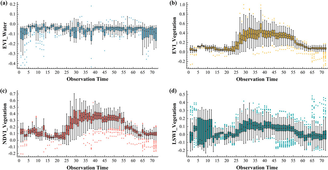 Figure 4. Temporal changes of water and vegetation pixels mapped with each index in 2022. (a) EVI of water pixels. (b) EVI of vegetation pixels. (c) NDVI of vegetation pixels. (d) LSWI of vegetation pixels.