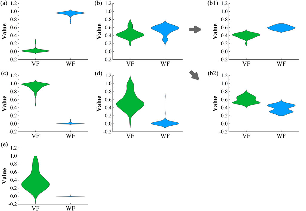 Figure 5. Map of quantity distribution in WF and VF for each type of sample points. (a) Permanent water. (b) Temporary water. (b1) Temporary water (WF > VF). (b2) Temporary water to vegetation (WF ≤ VF) (c) Terrestrial vegetation. (d) Temporary vegetation. (e) Barren.