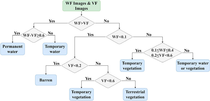 In selecting splitting attributes, we used comparative relations between WF and VF as the root node for constructing the DT classifier. Initially, we divided land cover types into two categories: those with higher WF and those with lower WF. The former included 2 types, PW and TW. From statistical analyses (Figure 4), we established “WF-VF = 0.6″as the segmentation threshold, reflecting the most significant difference for TW delineation. For the latter, we delineated other land cover types using different criteria. Employing “WF < 0.1 and VF < 0.2,” we identified B.
