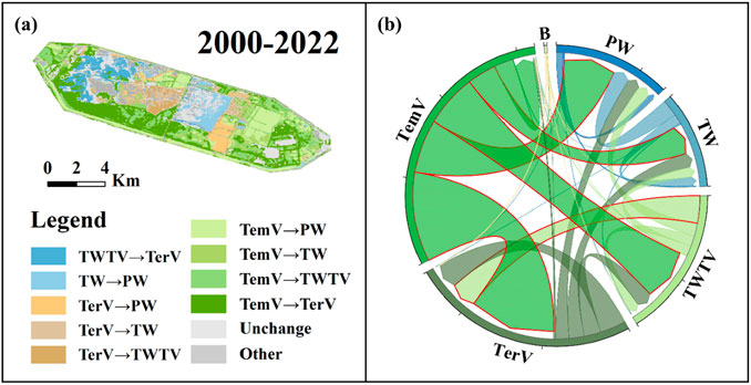 Figure 8. Type conversion during 2000–2022. (a) Shows the spatial conversion of major land cover types. (b) Shows the conversion ratio of each type and the most varied type highlighted in red.