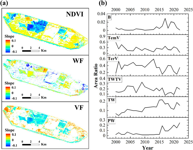 Figure 9. (a) Temporal changes of NDVI, WF and VF in Beidagang Wetland during 2000–2022. (b) The area ratio’s change of six land cover types during 2000–2022.