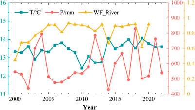 Figure 11. Temperature and precipitation of Beidagang Wetland during 2000–2022, and WF of Duliujian River (WF_River) during 2000–2020.