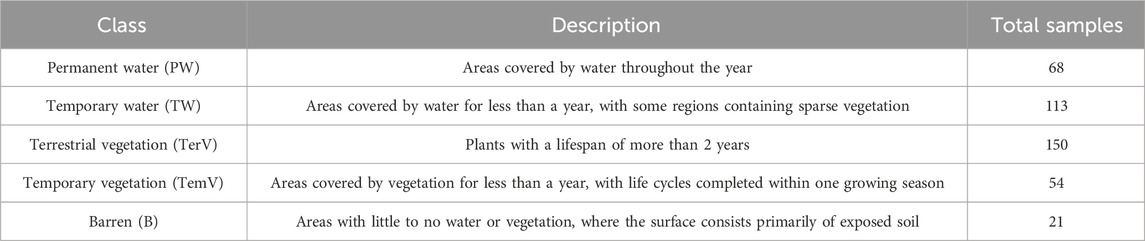 The sample points were collected on 18 July 2023. Using the Garmin eTrex 221X Outdoor Handheld GPS Navigator, we recorded the coordinates of each sample point. We recorded each type of ground objects from both sides of the road, and the areas obscured by Phragmites australis were interpreted manually aided by drone imagery. We utilized the M300 RTK equipped with a Mono×5+RGB detector, flying at an altitude of 100 m. A total of 406 sample points were collected in this study, and five classes were determined according to the actual environment: permanent water (PW), temporary water (including temporary water to vegetation) (TW, TWTV), terrestrial vegetation (TerV), temporary vegetation (TemV) and barren (B) (Figure 1b). To ensure balanced representation across all classes during training and validation, stratified random sampling method was adopted to divide all samples into two parts, with 80% allocated for training and 20% for validation. Ultimately, our dataset comprised 321 training points and 85 validation points (Table 1).