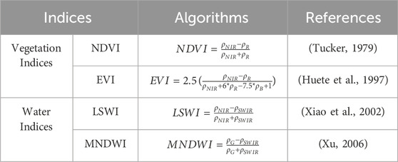 Before calculating WF and VF, it is necessary to extract water and vegetation pixels. In the study, we devised methods for water and vegetation identification, employing four spectral indices: Normalized Difference Vegetation Index (NDVI), Enhanced Vegetation Index (EVI), Modified Normalized Difference Water Index (MNDWI), and Land Surface Water Index (LSWI). NDVI stands out as a robust indicator, offering insights into the spatial distribution, density, and biomass of vegetation, along with canopy background information (Tucker, 1979). EVI, an enhancement of NDVI, mitigates atmospheric interferences and exhibits heightened sensitivity in areas with high biomass (Huete et al., 2002). LSWI utilizes near-infrared and short-wave infrared bands, sensitive to moisture content of the vegetation (McFeeters, 1996). Simultaneously, we employed MNDWI, which combines green and shortwave infrared bands to enhance open water features while mitigating noise from vegetation and soil (Xu, 2006). These indices, including NDVI, NDWI, LSWI, and MNDWI, are detailed in Table 2, where ρ represents the spectral reflectance. “Blue (B)”, “Green (G)”, “Red (R)”, “NIR” and “SWIR” correspond to B1, B2, B3, B4 and B5 of Landsat-5 and Landsat-7, while for Landsat-8 and Landsat-9, they correspond to B2, B3, B4, B5, and B6.