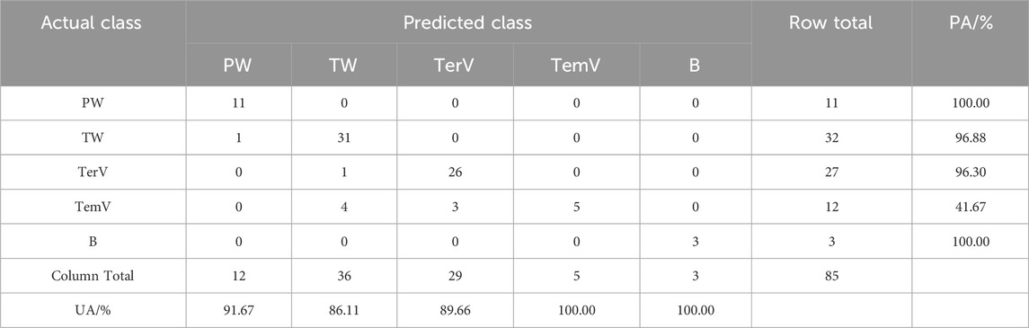 The accuracy of classification results is evaluated by calculating the confusion matrix based on validation samples. The confusion matrix, also known as the error matrix, is the most basic, intuitive, and simplest method to calculate the accuracy of a classification model (Svoboda et al., 2022). In image accuracy evaluation, confusion matrix is mainly used to compare classification results with actual measured points (Duro et al., 2012). More advanced classification indicators can be obtained from the confusion matrix. In the study, we selected Overall Accuracy (OA), Kappa coefficient, Producer’s Accuracy (PA) and User’s Accuracy (UA) for accuracy assessment. OA refers to the proportion of correctly classified pixels relative to the total number of pixels. The Kappa coefficient is calculated using Equation 5.