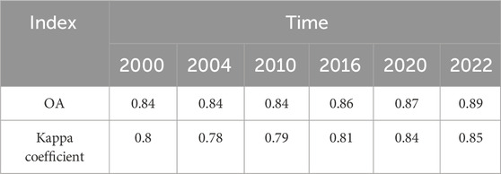 Among them, “P0” is for OA, “Pe” is calculated as the sum of the products of the actual and predicted quantities for all categories, divided by the square of the sum of the matrix elements. The Kappa coefficient ranges from −1 to 1, usually greater than 0. The higher Kappa coefficient, the better the classification effect. What’s more, the producer’s Accuracy is the probability that the real reference data of a certain type is correctly classified (Dai et al., 2021). The user’s accuracy is calculated by dividing the reference data of a certain type by the real collected points (Dai et al., 2021).