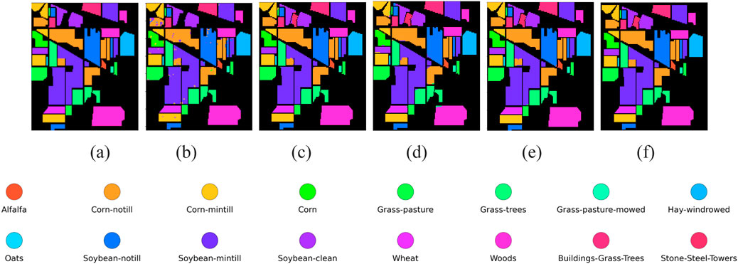 Figure 2. Classification maps on the IP dataset (a) Ground truth (b) 3D-CNN (c) MDGCN (d) AMGCFM (e) DSM-S2GCN (f) MS-GWCN.