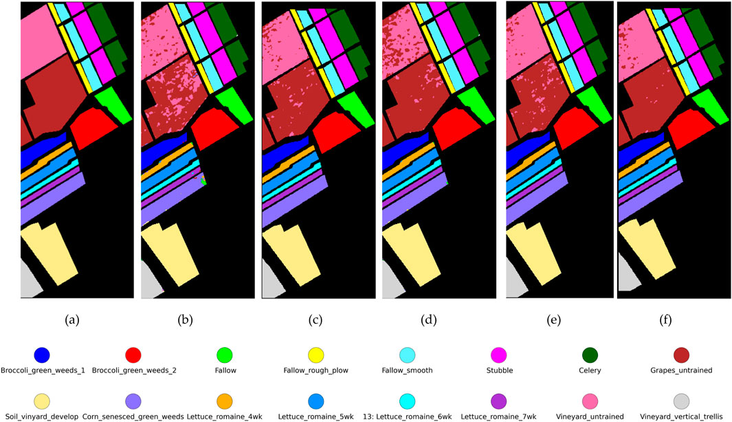 Figure 3. Classification maps on the SA dataset. (a) Ground truth (b) 3D-CNN (c) MDGCN (d) AMGCFM (e) DSM-S2 GCN (f) MS-GWCN.