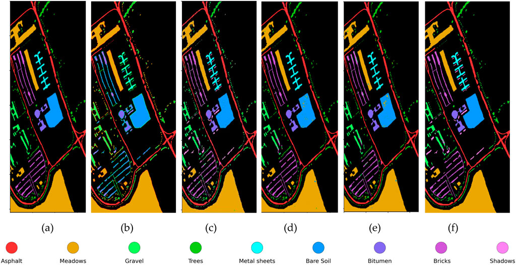 Figure 4. Classification maps on the PU dataset. (a) Ground truth (b) 3D-CNN (c) MDGCN (d) AMGCFM (e) DSM-S2GCN (f) MS-GWCN.