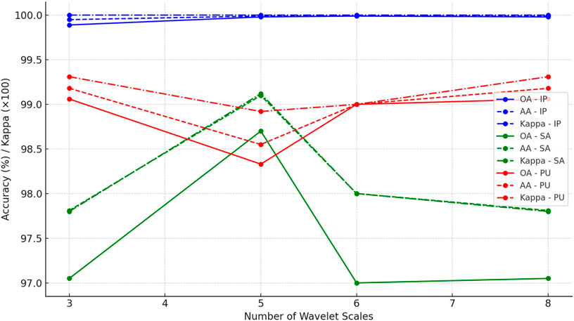 Our implementation of GraphWaveletConv(in_channels, out_channels, wavelet_scales = k) establishes k parallel GCNConv layers and synthesizes their outputs, effectively extracting features at k “wavelet” resolutions. To evaluate the optimal number of scales, we trained four variants of MS-GWCN on the hyperspectral dataset, setting wavelet_scales to 3, 5, 6, and 8. All other configurations were constants, including the three-layer GraphWaveletConv stack, hidden dimensions, optimizer, learning rate schedule, and 4-neighborhood graph connectivity. The line plot visualizes the performance of MS-GWCN across different wavelet scales (3, 5, 6, and 8) for the IP, SA, and PU datasets. The plot including the metrics for Overall Accuracy (OA,%), Average Accuracy (AA,%), and the Kappa coefficient (κ, ×100) are presented in Figure 5.