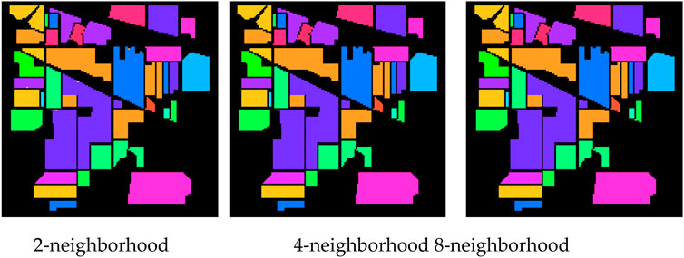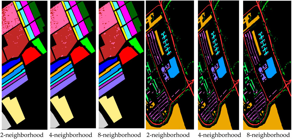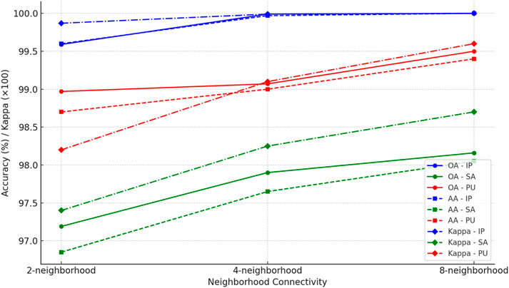Moreover, the κ(×100), which quantifies the agreement between predicted and actual labels while correcting for chance, increases as the neighborhood size expands, particularly in the IP and PU datasets. On the IP dataset, the κ(×100) reaches 100 with the 8-neighborhood setting, indicating perfect agreement with the true ground labels and reflecting the MS-GWCN’s ability to handle complex spatial dependencies across the dataset. On the SA dataset, the Kappa value increases from 97.40 (2-neighborhood) to 98.70 (8-neighborhood), reinforcing the notion that richer pixel connectivity enhances the model’s spatial feature aggregation, particularly in regions with finer textures. On the PU dataset, the Kappa improves from 98.20 (2-neighborhood) to 99.60 (8-neighborhood), indicating that more neighbors enable the model to better classify fragmented urban classes, especially in areas where smaller features (e.g., roofs or pavements) require more spatial context.