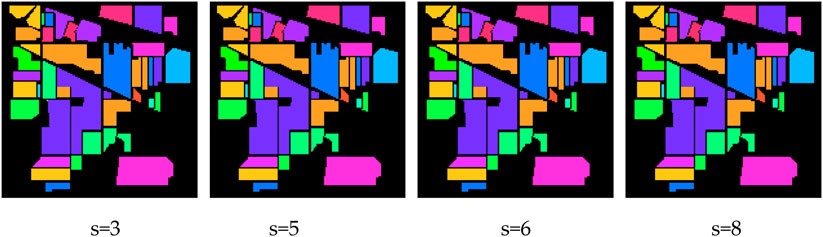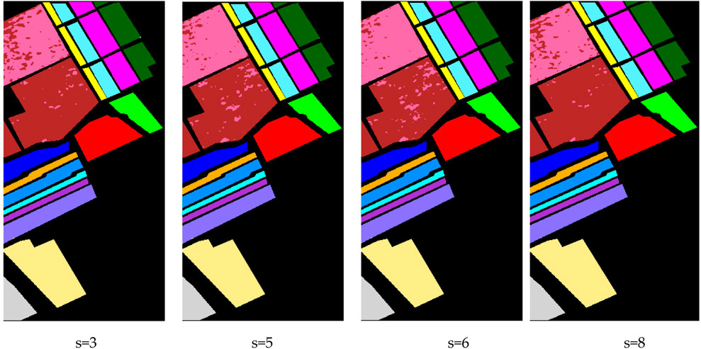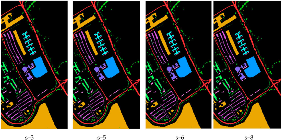 Figures 7–11, collectively illustrate how MS-GWCN responds to wavelet-scale configurations and spatial-graph connectivities on three benchmarks. In Figures 7–11, we vary the number of wavelet channels on the datasets. A consistent pattern emerges, indicating that incorporating additional scales enhances smoother regional delineation and more distinct class boundaries. At low scale counts (e.g., three channels), small clusters of misclassified pixels persist around object edges; by contrast, six or eight scales produce markedly cleaner maps.