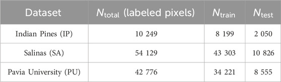Table 1. Dataset statistics for IP, SA, and PU: total number of labeled pixels and 80:20 train-test split.