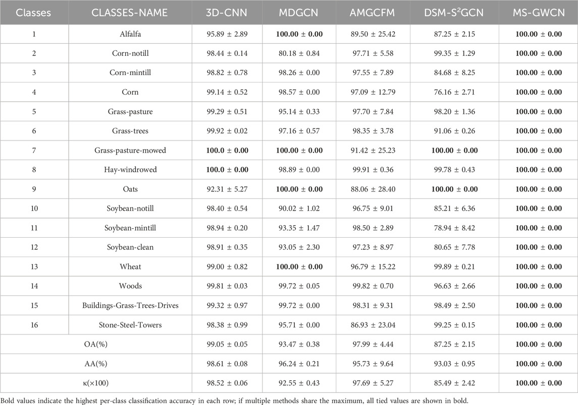 As shown in Tables 2–4, the proposed method outperforms other compared frameworks on the OA, AA, and κ metrics for all three public datasets. On the IP dataset, MS-GWCN stands out as the top-performing model, achieving 100% accuracy across all classes, as well as excellent scores in OA, AA, and κ. This indicates that MS-GWCN is highly reliable and stable, with nearly flawless performance across the board. 3D-CNN follows closely, delivering strong overall performance (OA: 99.05%, AA: 98.61%, κ(×100): 98.52) with near-perfect accuracy (>99%) in agricultural and forest-related categories, such as Corn-notill (98.44% ± 0.14%), Soybean-clean (98.91% ± 0.35%), Grass-trees (99.92% ± 0.02%), and Woods (99.81% ± 0.03%). This strong performance of 3D-CNN provides reassurance to the audience about its reliability. However, its performance dips in specific classes, such as Alfalfa (95.89% ± 2.89%) and Oats (92.31% ± 5.27%), suggesting limitations in handling underrepresented or spectrally complex targets. AMGCFM achieves moderate metrics (OA: 97.99%, AA: 95.73%) but suffers significant volatility, excelling in Corn-notill (97.71% ± 5.58%) and Hay-windrowed (99.91% ± 0.36%) while collapsing in Alfalfa (89.50% ± 25.42%) and Stone-Steel-Towers (86.93% ± 23.04%). Similarly, MDGCN exhibits class-specific inconsistencies, achieving 100% accuracy in Alfalfa, Oats, and Wheat but struggling in complex classes such as Corn (76.16% ± 2.71%) and Soybean-clean (80.65% ± 7.78%), resulting in the lowest overall metrics (OA: 93.47%, κ(×100): 92.55). DSM-S2GCN is the least effective model, with an overall accuracy (OA) of 87.25%, which is significantly lower than that of the other models. Despite perfect accuracy in Grass-pasture-mowed and Oats, it fails catastrophically in critical classes like Corn (76.16% ± 2.71%) and Soybean-notill (80.65% ± 7.78%), highlighting its inability to generalize across diverse spectral features.
