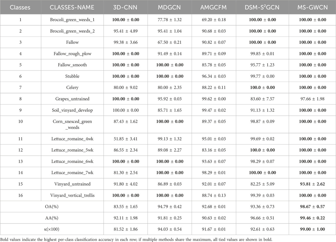On the SA dataset (Table 3), MS-GWCN emerges as the unequivocal leader, achieving 100.00% ± 0.00% accuracy in 13 out of 16 classes (e.g., Broccoli_green_weeds_1, Fallow_smooth, Vinyard_vertical_trellis) and near-perfect overall metrics (OA: 98.67% ± 0.57%, AA: 99.46% ± 0.22%, κ(×100): 99.00 ± 1.00). Its zero standard deviation (±0.00) in dominant classes underscores exceptional stability, likely attributable to its advanced multi-scale graph operations for spatial-spectral feature integration. However, minor accuracy drops in Grapes_untrained (97.66% ± 1.98%) and Vinyard_untrained (93.81% ± 2.62%) suggest room for refinement in handling spectrally ambiguous or underrepresented targets. DSM-S2GCN, on the other hand, ranks second in overall accuracy (OA: 93.36% ± 0.73%) and exhibits polarized class performance. It achieves flawless results in Brocoli_green_weeds_1 (100.00% ± 0.00%) and Stubble (99.77% ± 0.00%) but struggles with Grapes_untrained (83.60% ± 7.57%) and Vinyard_untrained (82.25% ± 5.09%). Despite these limitations, its potential for future improvement is evident, offering hope for its future performance. Similarly, MDGCN (OA: 94.79% ± 0.42%) demonstrates class-specific excellence, attaining 100% accuracy in Fallow_smooth, Stubble, and Lettuce_romaine_7wk. Yet, catastrophic failures in Fallow (67.50% ± 0.21%) and Soil_vinyard_develop (85.71% ± 1.65%) reveal critical vulnerabilities in handling heterogeneous or low-sample-size categories. 3D-CNN delivers the weakest overall performance (OA: 83.55% ± 1.65%) despite sporadic successes such as 100% accuracy in Fallow_rough_plow and Vinyard_vertical_trellis. Severe underperformance in Lettuce_romaine_4wk (51.85% ± 3.41%) and Celery (80.00% ± 9.02%), coupled with high variability, underscores its instability for complex agricultural scenes. AMGCFM (OA: 92.68% ± 0.01%) exhibits erratic behavior, excelling in Lettuce_romaine_7wk (98.29% ± 0.01%) but collapsing in Brocoli_green_weeds_1 (69.20% ± 0.18%) and Fallow (90.82% ± 0.07%), with extreme standard deviations (e.g., ±0.18 in Brocoli_green_weeds_1) indicating sensitivity to training conditions.
