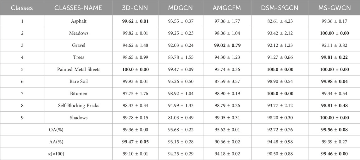 In the PU (Table 4), MS-GWCN reaffirms its dominance, achieving 99.56% ± 0.08% OA, 99.39% ± 0.27% AA, and κ: 99.46 ± 0.00, the highest metrics among all methods. It delivers 100.00% ± 0.00% accuracy in critical classes, such as Meadows, Painted Metal Sheets, and Shadows, with near-perfect performance in Asphalt (99.36% ± 0.17%) and Bare Soil (99.98% ± 0.04%). Its minimal standard deviations (e.g., ±0.00 in Shadows) underscore exceptional stability, solidifying its superiority in spectral-spatial feature integration. 3D-CNN ranks second (OA: 99.36% ± 0.01%, AA: 99.47% ± 0.05%, κ(×100): 99.10 ± 0.01), excelling in Painted metal sheets (100.00% ± 0.00%) and Bare Soil (99.93% ± 0.01%). However, it exhibits moderate volatility in Gravel (94.62% ± 1.48%) and Bitumen (97.75% ± 1.76%), revealing sensitivity to spectrally complex surfaces. AMGCFM (OA: 95.62% ± 0.01%, AA: 90.66% ± 0.02%) demonstrates high variability, collapsing in Bare Soil (87.59% ± 3.57%) despite strong results in Gravel (99.02% ± 0.79%) and Self-Blocking Bricks (98.79% ± 0.26%). Its erratic performance (e.g., ±3.57% in Bare Soil) questions its reliability for real-world deployment and suggests caution in its use. MDGCN (OA: 95.68% ± 0.22%, κ(×100): 94.25 ± 0.29) struggles in classes requiring fine-grained discrimination, Severe underperformance in Shadows (81.03% ± 0.49%) and Trees (83.78% ± 1.55%). Moderate accuracy in Asphalt (93.55% ± 0.37%) and Self-Blocking Bricks (94.99% ± 1.33%). DSM-S2GCN ranks last (OA: 92.72% ± 0.76%, κ: 90.50 ± 0.88), with catastrophic failures in Asphalt (82.61% ± 4.23%) and Meadows (93.42% ± 2.12%). Despite achieving perfect scores in Bitumen (100.00% ± 0.00%) and Painted metal sheets (100.00% ± 0.00%), its inability to generalize across classes, such as Gravel (92.12% ± 1.23%), highlights architectural limitations.