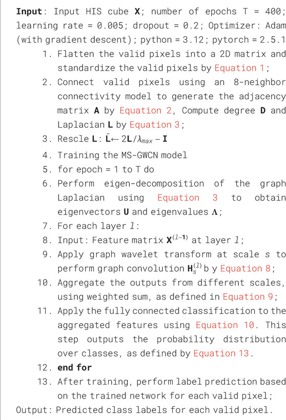 By combining these components, the MS-GWCN effectively captures both local and global features from the HSI data, leveraging the multi-scale graph wavelet transform and deep graph convolutional learning to achieve high classification accuracy. The implementation details of our MS-GWCN are shown in Algorithm 1.