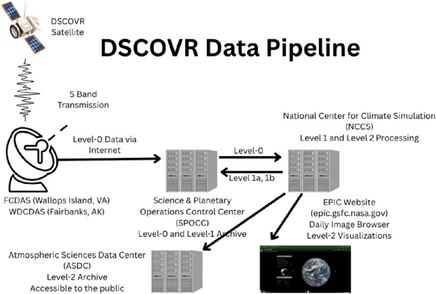 The DSCOVR Satellite sends data from the EPIC and NISTAR instruments via S-band to ground stations in Fairbanks Alaska and Wallops Island Virginia. The level 0 data is transmitted using a secure connection from the ground stations to the SPOCC (Science and Planetary Operations and Control Center) at Goddard Space Flight Center, where it is archived. From there, the data is moved to the NCCS (National Center for Climate Simulation), a high-performance computing center at Goddard. The data is processed on the NCCS into Level-a, -1b and Level-2 data products. Finally, the data is moved for archiving to the ASDC (Atmospheric Sciences Data Center) where it is ingested and made available to the public in a user-friendly HDF 5 file (see Figure 1).