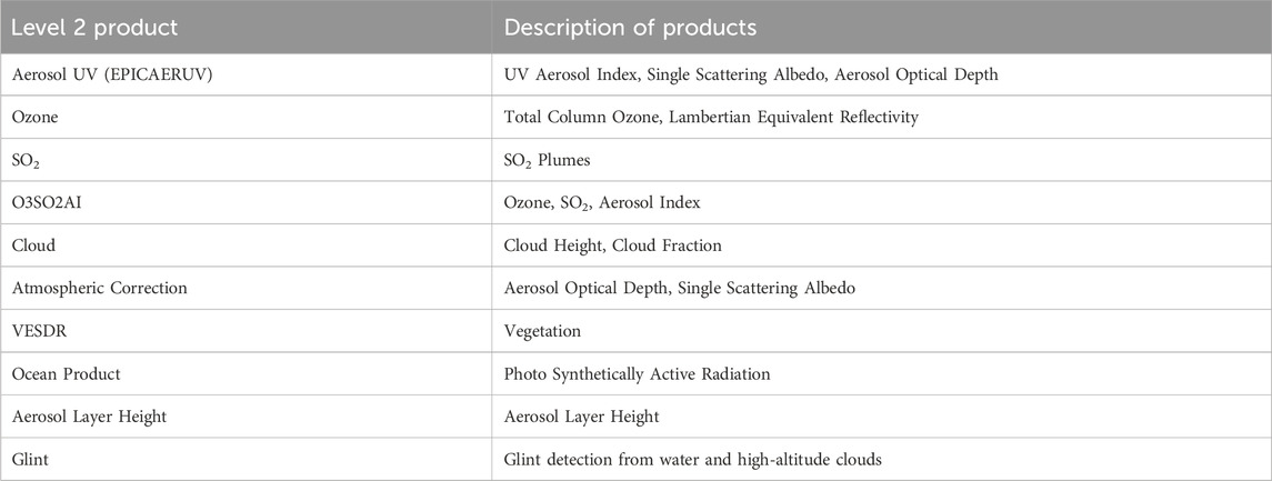 EPIC Level-2 science products cover a wide range of applications for studies of the atmosphere, land, and ocean systems. Data derived from EPIC observations are called EPIC level 2 products. An example is the EPICAERUV Level 2 product that derives an Aerosol UV index, the Aerosol Optical Depth, and Aerosol Single Scattering Albedo (Anh et al., 2021). These measurements are useful in studying smoke from wildfires and dust plumes from the Sahara Desert. The Total Ozone product produces total column ozone needed to estimate the amount of UV radiation that reaches the surface when combined with the Lambertian Equivalent Reflectivity that provides a measure of cloud reflection and transmission of radiation (Huang and Yang, 2022). The SO2 product is used track volcanic plumes. The Cloud product tracks various cloud types, altitude, and geographic coverage. An interesting side product from EPIC is the detection of glints from horizontally oriented ice crystals in high clouds (Marshak et al., 2017). Other Level 2 products are described in Table 1.