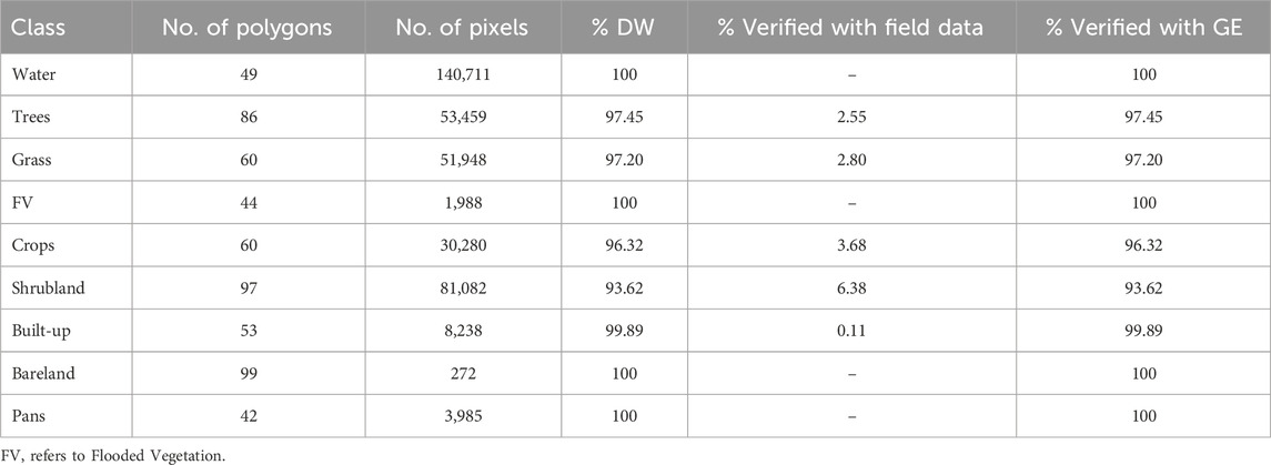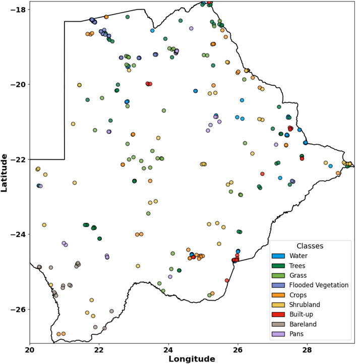 Stratified random sampling was applied to the DW map to select pixels representing all land cover classes for training and testing (Foody, 2002; Olofsson et al., 2021). Given the limited coverage of some classes in Botswana, the sampled DW points were cross-checked against independent field survey data and GE imagery. Only points where there was agreement among all three sources (DW, field surveys, GE) were retained. In cases where field data were not available, the points were included for training only if there was clear agreement between DW and GE. Importantly, if the DW classification disagreed with field survey observations, the point was relabeled according to the field survey, effectively refining the DW map. This procedure ensured that DW served as a reliable source of ground truth, while field surveys and GE provided independent verification of training/validation points, as shown in Table 1. Figure 2 shows the location of polygons used for training. Although Table 1 lists numerous polygons, the map displays them as small point clusters because several polygons are situated very close to each other, causing the enclosed pixels to appear stacked in the visualization at the current scale of the map.
