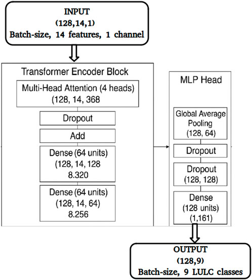 , treating the 14 features as a sequence of tokens (Figure 3). Each feature was projected into a 64-dimensional embedding space using a dense layer, enabling richer feature representation, similar to applications in non-textual domains. Since the features do not possess an inherent sequential order, no positional encoding was applied. The features were used in the following fixed order to ensure: SR_B1, SR_B2, SR_B3, SR_B4, SR_B5, SR_B6, SR_B7, EVI, NBR, NDMI, NDWI, NDBI, NDBaI, and elevation. The embedded features passed through a Transformer Encoder block, consisting of: 1. Multi-Head Self-Attention (MHSA) with 4 attention heads, enabling the model to learn complex dependencies across features; 2. Position-wise Feed-Forward Network (FFN) with 128 hidden units, followed by a projection back to 64 dimensions, allowing the model to learn non-linear combinations of features; and 3. Residual connections, Layer Normalization, and Dropout (rate = 0.2) for improved training stability, convergence, and overfitting prevention. The output from the Transformer encoder was passed through a Global Average Pooling (GAP) layer, aggregating the feature sequence into a fixed-length vector. GAP reduces trainable parameters compared to flattening, aiding in preventing overfitting (Lin et al., 2003). Two fully connected layers with dropout regularization (rate = 0.3) were then applied to introduce non-linearities and improve generalization. The final classification was performed using a dense softmax output layer with 9 units, corresponding to the nine LULC classes (see Figure 3). The model was compiled using the Adam optimizer (Kingma and Ba, 2014) with a learning rate of