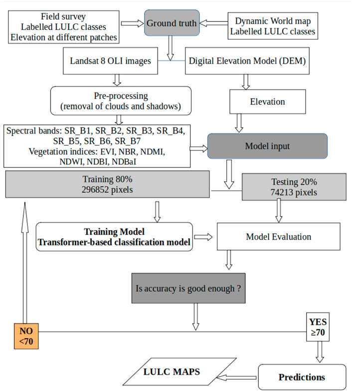 During data collection from multiple polygons, the dataset was partitioned using a pre-assigned sample column, where each observation was tagged as either train or test. This column was generated through a stratified random sampling procedure, ensuring that 80% of the pixels from each land cover class were allocated to the training set and 20% to the testing set. This approach preserved class proportions across subsets and reduced bias from imbalanced class representation. The partitioning scheme was stored within the dataset to guarantee reproducibility. In total, 371,065 pixels were collected, with 296,852 pixels assigned to training and 74,213 to testing. Training proceeded iteratively, where the Transformer architecture learned to map input feature sequences to LULC labels by minimizing classification error. During each epoch, the model processed mini-batches, computed predicted probabilities, and compared them to true labels using categorical cross-entropy loss. Loss gradients were propagated backward to update model parameters via the Adam optimizer (Kingma and Ba, 2014), which is known for adaptive learning rates and stability in DL. The methodological flowchart is shown in (Figure 4).