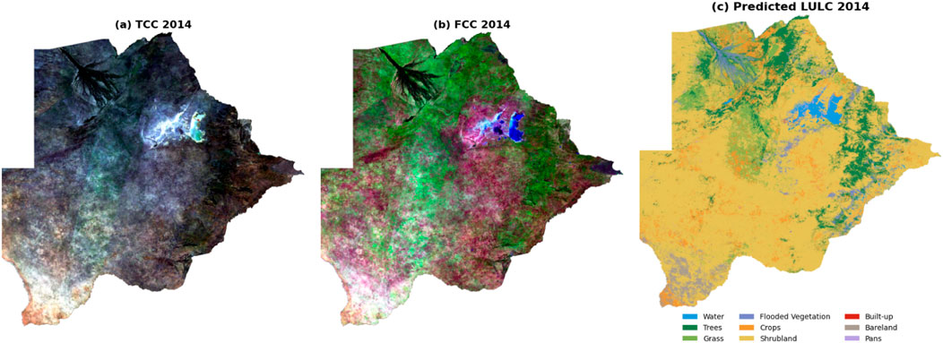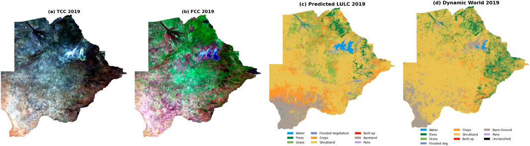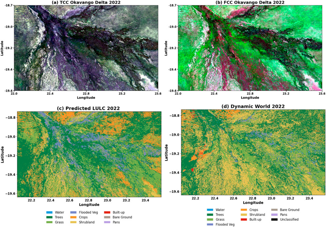 To overcome these challenges and enhance the discrimination of LULC types, a false color composite (FCC) was generated using Bands 7 (Shortwave Infrared), 5 (Near-Infrared), and 3 (Green). The FCC allows for a more effective differentiation of vegetation and other land cover types, as healthy vegetation appears in shades of green due to strong reflection in the near-infrared (NIR) band. This makes it easier to identify dense vegetation areas (Song et al., 2017). Areas exhibiting reddish tones in the FCC are typically indicative of stressed or sparse vegetation, which may also reflect transitional zones where vegetation is either degrading or upgrading. Such patterns are often associated with varying soil moisture levels that influence vegetation growth (Li et al., 2011). For instance, in the Okavango Delta (Figure 5), areas with saturated soils, shadowed wetlands, or waterlogged vegetation appear as dark regions in the TCC (Figure 5a) and green in the FCC images (Figure 5b), whereas same areas appear as trees and grass in the predicted map (Figure 5c). In contrast, they appear as trees, grass, and shrubland in the Dynamic World map (Figure 5d), reflecting the specific environmental conditions of wetlands and floodplains (Fang et al., 2010).