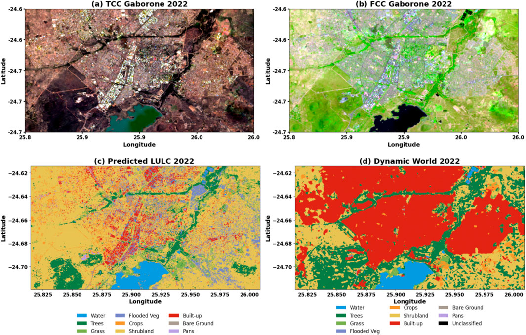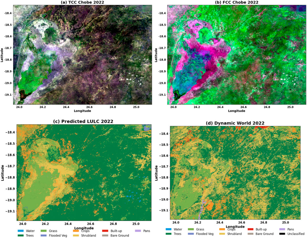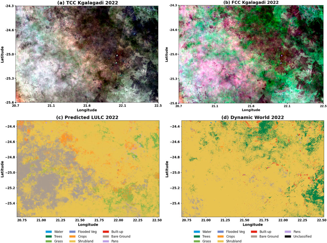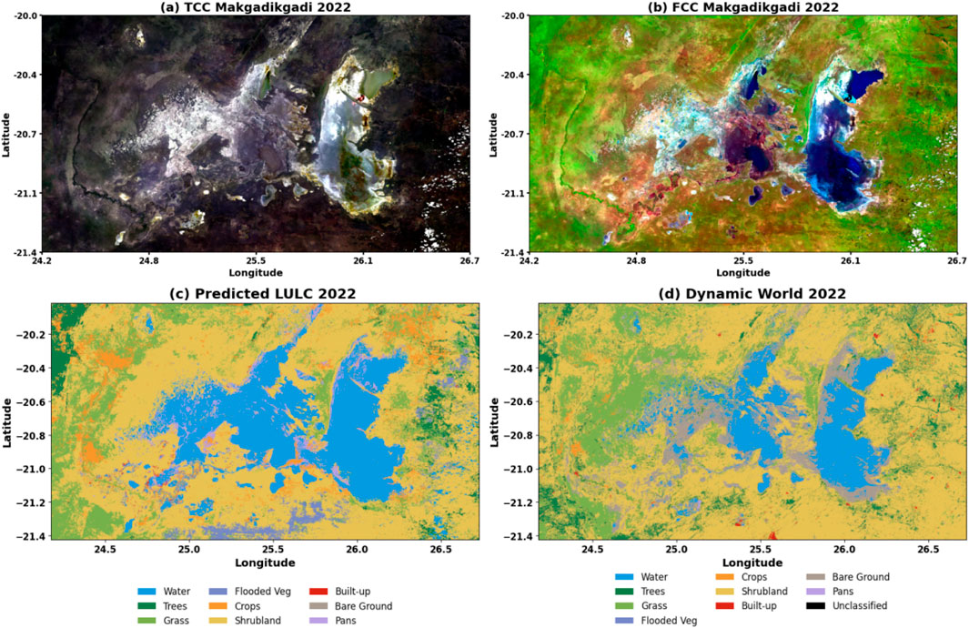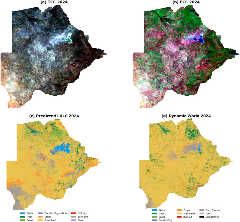 Several distinct land cover patterns during January-March 2024 emerge from the composites and predicted LULC maps, offering critical insights into model performance (Figure 13). Wetlands and water-saturated vegetated areas, such as those in the Okavango Delta, manifest in darker shades, and water bodies—especially near the Makgadikgadi Pans—are highlighted in blue in the FCC images. This spectral behavior is consistent with findings by Braga et al. (2021), who emphasize the role of NIR and SWIR in vegetation and moisture differentiation. Similarly, Kirimi et al. (2018) reported that FCC imagery is particularly effective in delineating seasonal water bodies in sub-Saharan Africa. The 2024 predicted LULC map (Figure 13c) shows strong visual alignment with both the FCC (Figure 13a) and TCC (Figure 13b) images, with clearer land cover class boundaries compared to the Dynamic World map (Figure 13d). The Dynamic World map significantly underrepresents water features over the Pans region, contrary to the FCC and predicted maps that more accurately capture the expected inundation during the summer rainy season. This mismatch may stem from the Dynamic World algorithm’s reduced sensitivity to ephemeral or shallow water bodies, a limitation noted in global classifiers that rely on coarser temporal and spatial generalizations (Sogno et al., 2022).