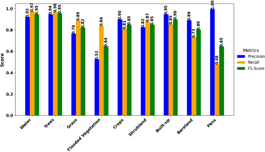 The performance of the Transformer-based model was further evaluated using several metrics, including precision, recall, and the F1 score, across various land cover classes, as shown in (Figure 10). These metrics provide a more nuanced understanding of the model’s ability to not only identify land cover types but also minimize both false positives and false negatives. Precision, recall, and F1 score are essential for assessing classification performance, particularly when dealing with imbalanced datasets and complex land cover types (Sim et al., 2024).