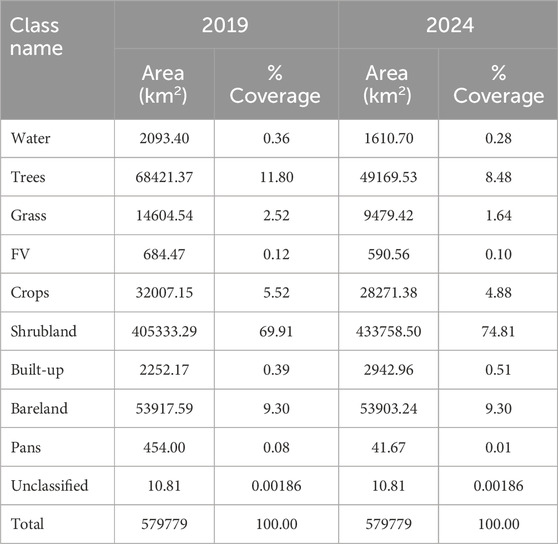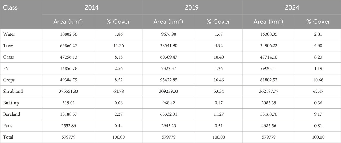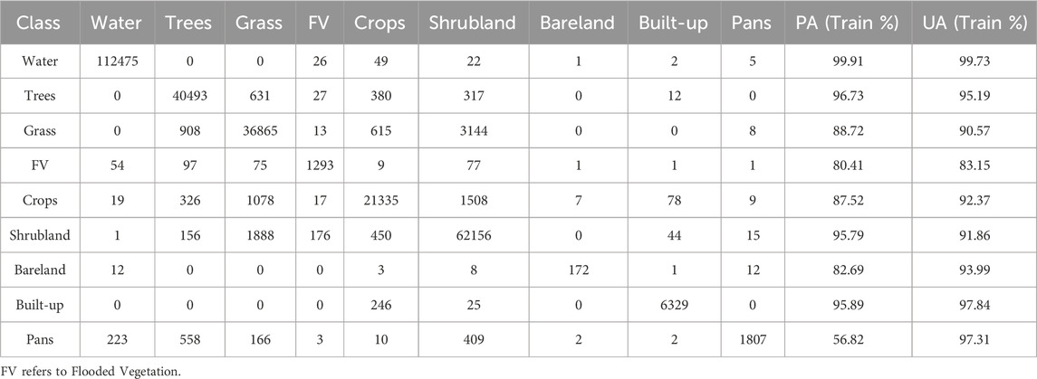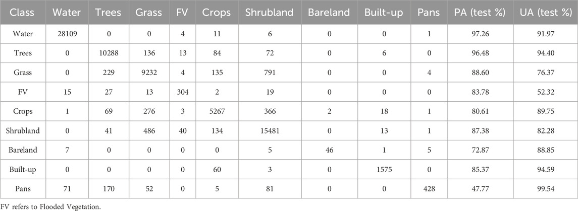 The model was trained on 296,852 labeled pixels across nine LULC classes and performed well in most categories. The overall producer’s accuracy (PA) varied among the nine land cover classes, reflecting differences in per-pixel feature vector distinctiveness and classification performance (see Table 3). The accuracy rates were as follows: Water (99.91%), Trees (96.73%), Shrubland (95.79%), and Bareland (95.89%). Additionally, the accuracy for Grass was 88.72%, Crops 87.52%, Built-up areas 82.69%, and Flooded Vegetation 80.41%. The results indicate excellent model performance, likely due to its unique and easily identifiable spectral signature, aided by the use of vegetation indices that enhanced separability (Zhang et al., 2020; Zhao et al., 2020). However, the Pans class showed lower PA (56.82%), likely due to seasonally varying signatures contained in the spectral bands and indices, which were affected by contamination from elevated water levels in some summers. Additionally, its low frequency in the training set made it harder to distinguish from water bodies during the wet season (Chiloane et al., 2020). The Flooded Vegetation and Built-up classes also displayed moderate PA values (0.79), suggesting challenges in differentiating them due to spectral mixing in heterogeneous zones, a common issue noted in Transformer-based models (Marjani et al., 2025). Despite these challenges, the model demonstrated high UA