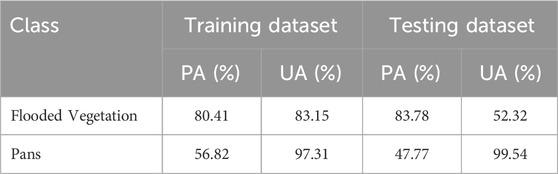 Flooded Vegetation and Pans were among the most challenging classes to classify accurately. Table 5 presents a side-by-side comparison of PA and UA for these classes based on both the training and testing datasets. For Flooded Vegetation, the model achieved relatively high PA (80.41% on training and (83.78%) on testing, indicating that most actual Flooded Vegetation pixels were correctly identified. However, the UA was considerably lower on the testing dataset (52.32%), suggesting that a substantial portion of pixels predicted as Flooded Vegetation actually belonged to other classes. This discrepancy likely stems from spectral similarities between Flooded Vegetation and nearby vegetated areas, such as Trees or Grass, which can confuse the classifier.