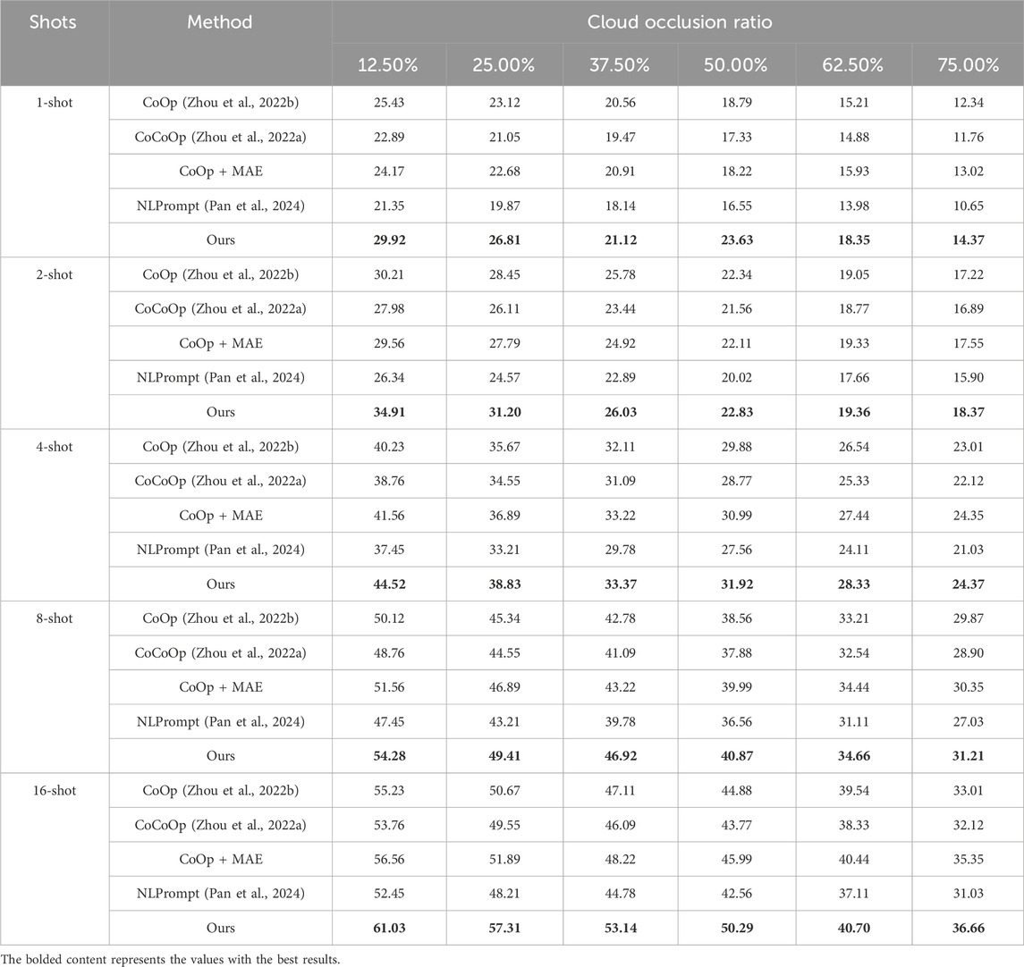 As shown in Table 2, our proposed method demonstrates significant advantages in remote sensing image recognition under cloud occlusion. It achieves optimal performance across all 30 comparative experiments, particularly excelling under high occlusion (75.00%) and few-shot (1-shot) scenarios. Compared to the best-performing baseline (CoOp + MAE), our method improves average accuracy by 3.6%, with the maximum gain in the 16-shot/12.50% scenario (61.03% vs. 56.56%). These results validate the effectiveness of our cloud-feature adaptive learning mechanism.