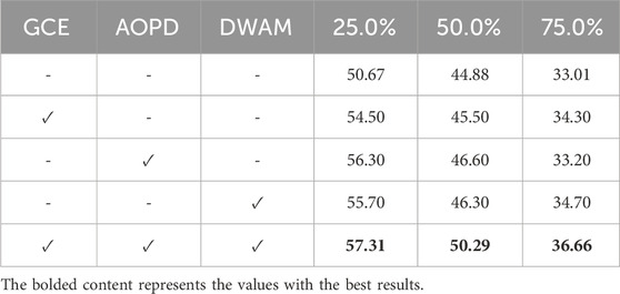 As shown in Table 3, we systematically evaluate the synergistic effects of generalized cross entropy (GCE), Adaptive Optimization Prompt Design (AOPD), and Dynamic Weight Adjustment Mechanism (DWAM). Experiments demonstrate that individually introducing any module improves baseline performance, with DWAM yielding a 3.1% gain under 75% occlusion, highlighting its adaptability to extreme occlusion. Further analysis reveals functional complementarity: GCE enhances noise robustness, AOPD optimizes occlusion feature reconstruction, and DWAM achieves cross-modal dynamic balancing. When integrating all modules, the model reaches 50.30% accuracy under 50% occlusion—a 0.6 percentage point improvement over baseline, validating the efficacy of collaborative module design.