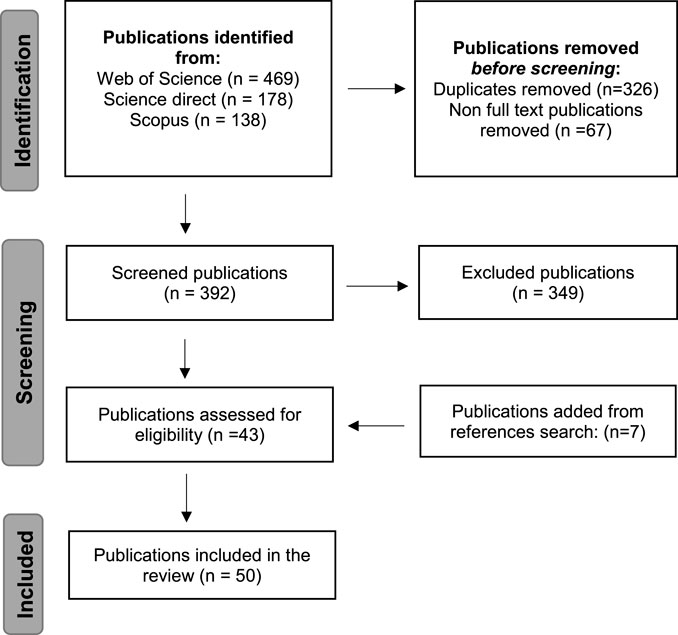 A total of 785 publications were initially retrieved from the WOS, Scopus, and Science Direct databases (Figure 1). After removing 326 duplicates and 67 non-full text articles, the abstracts of the remaining publications were critically evaluated to identify those focused on the remote sensing of vegetation BGB. Subsequently, 43 publications were identified as suitable for inclusion in the review. Thereafter, by examining the reference lists of these 43 publications, 7 relevant articles were added, resulting in a final total of 50 publications included.