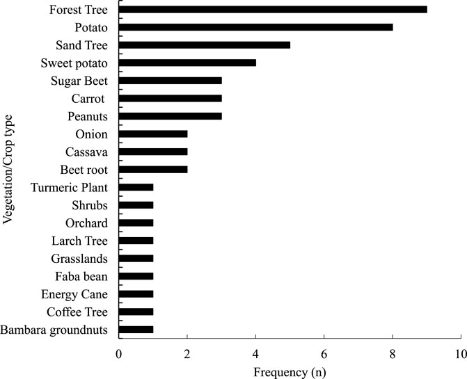 The recent response to climate action has drawn more attention to forest research to comprehensively optimize techniques on carbon sequestration (Dainelli et al., 2021). In addition, forests ecosystems are characterized by high economic value in revenue as trees are predominantly used for various applications such as timber (Fassnacht et al., 2024). Likewise, agricultural crops such as the Neglected and Underutilized Crops (NUCs) have recently gained popularity due to their high nutritive value and potential to enhance food security (Mudau et al., 2022). Furthermore, the recent population growth and high demand for food has brought attention to agricultural crops research, aiming to optimize production and meet the growing demand (Mabhaudhi et al., 2022). For instance, studies like Jewan et al. (2022) assessed the utility of commercial UAV platforms and low cost cameras in estimating Bambara groundnut yield to optimize its production. Despite grasslands and shrubs forming an essential source of grazing and browsing in large ecosystems such as rangelands and protected areas as noted by Masenyama et al. (2022), very few publications were recorded in this regard (Figure 2). Nevertheless, grasslands and rangelands provide essential ecosystem and socioeconomic services as reported by Chapungu et al. (2020), hence further research is needed to fully assess and maintain their stability.